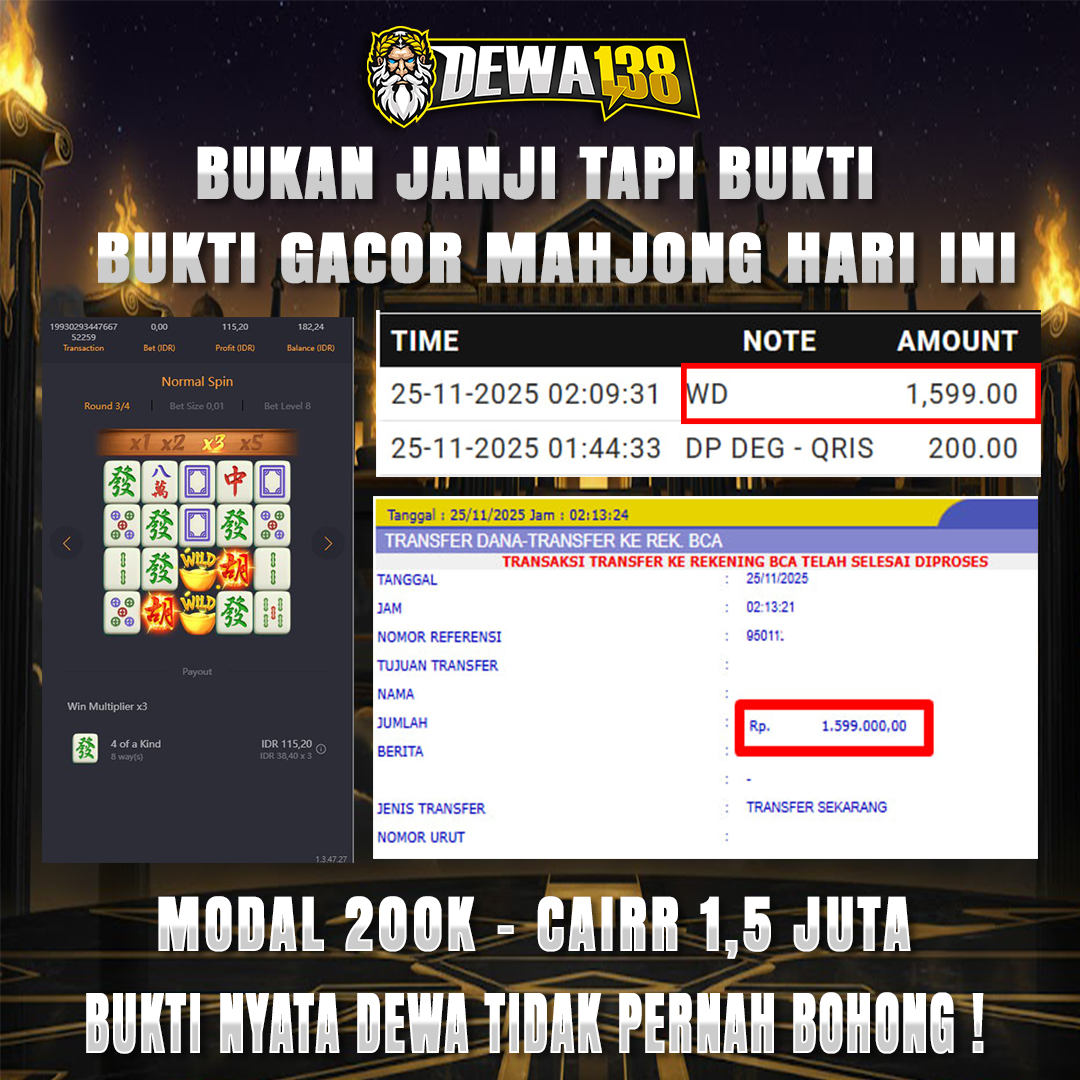 DEWA138 menghadirkan game jackpot vip yang di lengkapi fitur khusus new member hanya dengan modal deposit 200k dijamin akan withdraw 1,5+ juta malam ini.